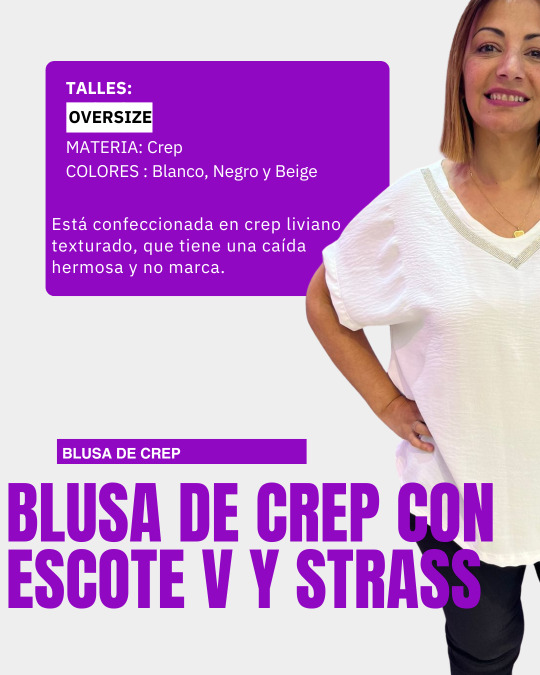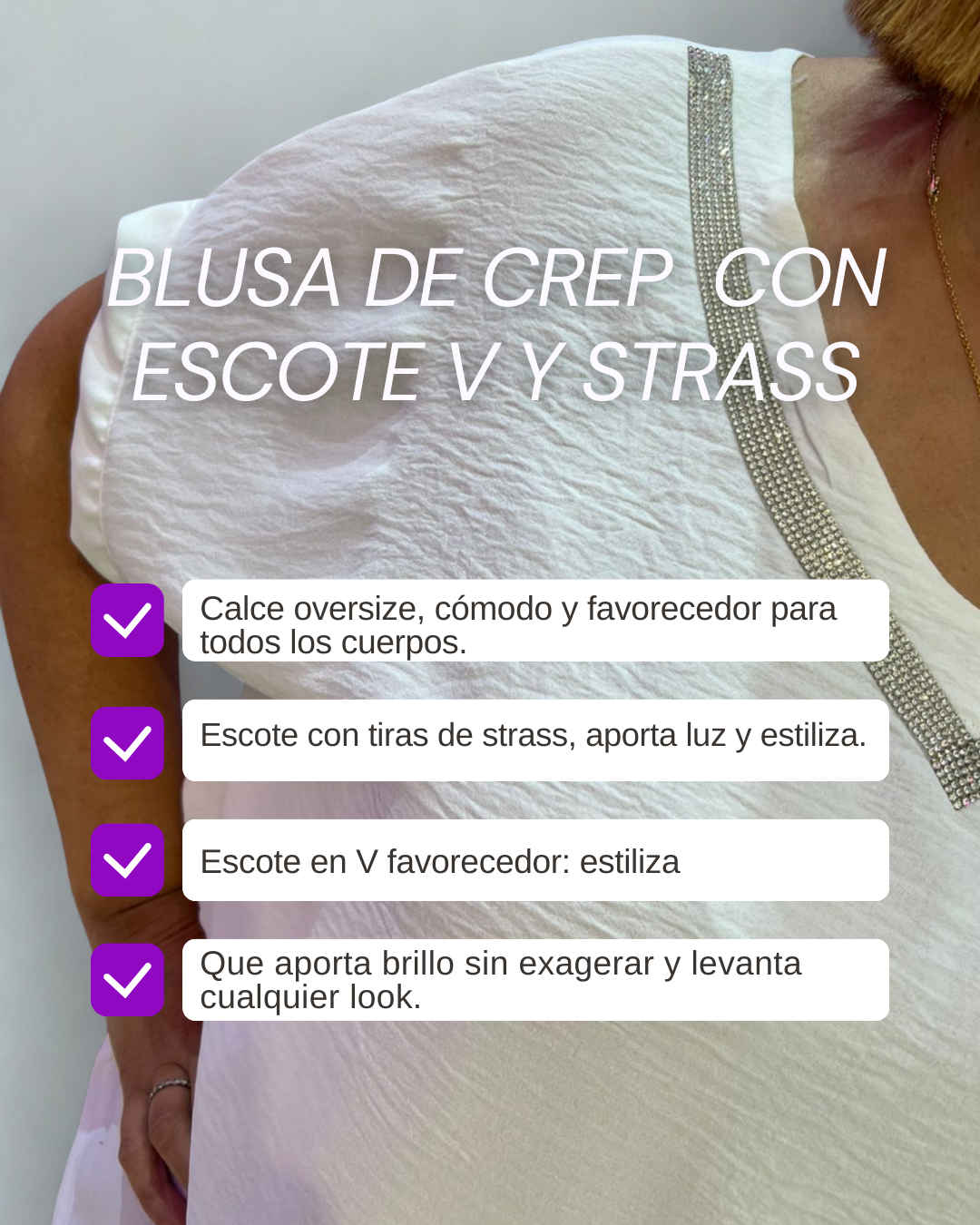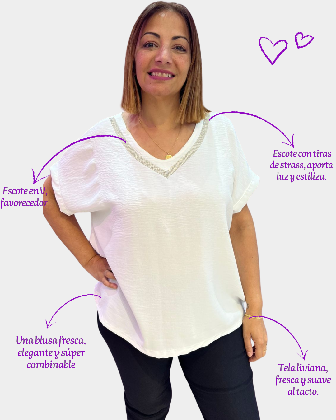 Una blusa fresca, elegante y súper combinable. Está confeccionada en crep liviano texturado, que tiene una caída hermosa y no marca. El escote en V está realzado con una tira de strass delicada, que aporta brillo sin exagerar y levanta cualquier look.