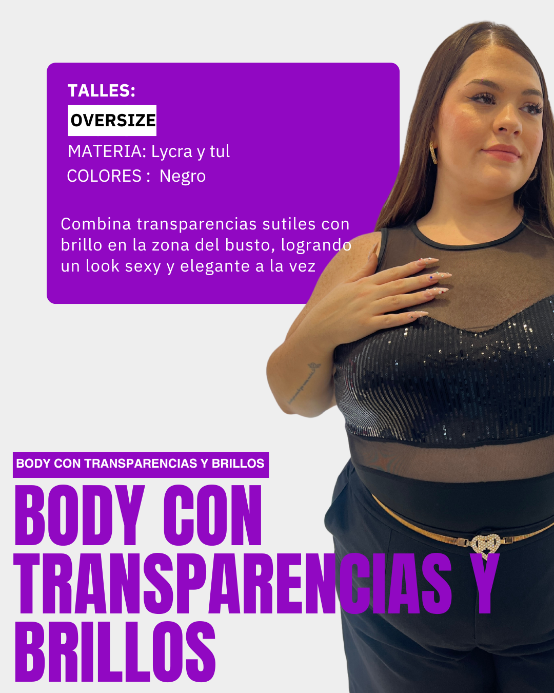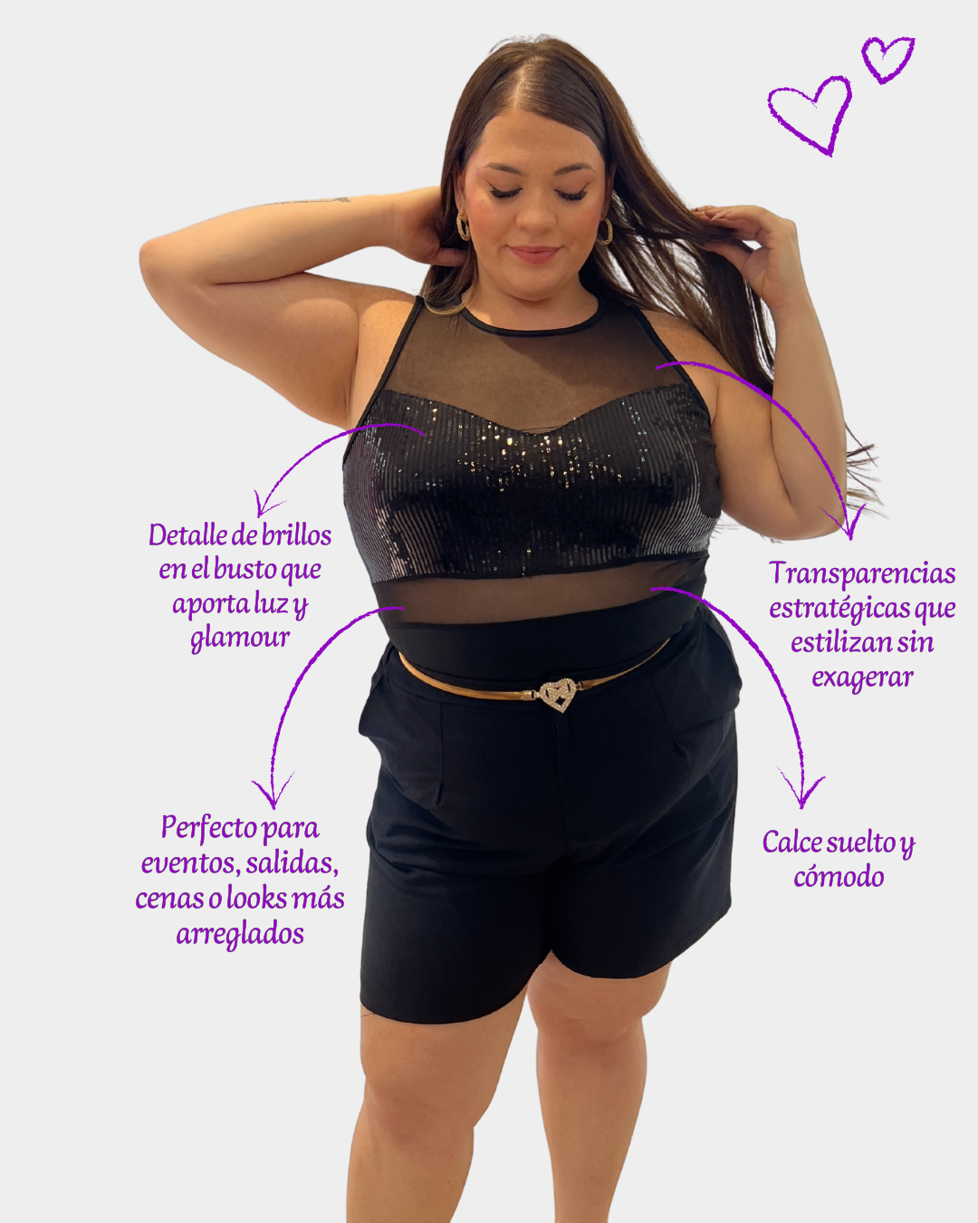 Este body es puro impacto. Combina transparencias sutiles con brillo en la zona del busto, logrando un look sexy y elegante a la vez. Su diseño realza la parte superior del cuerpo sin perder comodidad, ideal para salir de noche o armar un outfit protagonista con pantalón o falda.