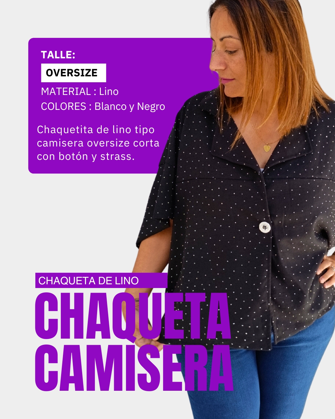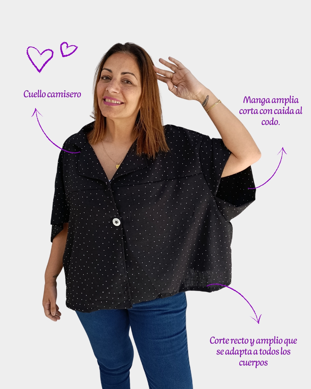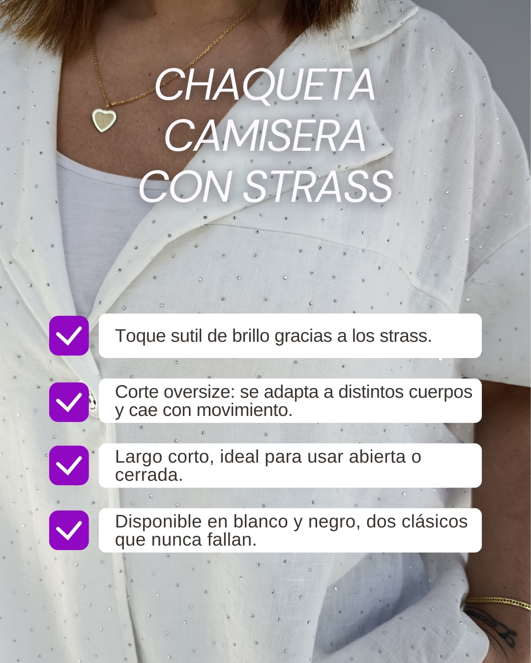 Una prenda corta y canchera que combina el estilo de una camisa con la comodidad de una chaquetita. Con corte oversize y detalles de mini strass que iluminan el look, es ese comodín que transforma un jean y remera básica en un outfit lleno de onda.