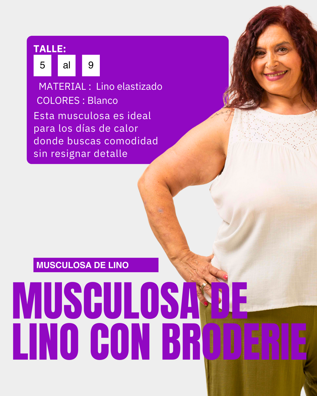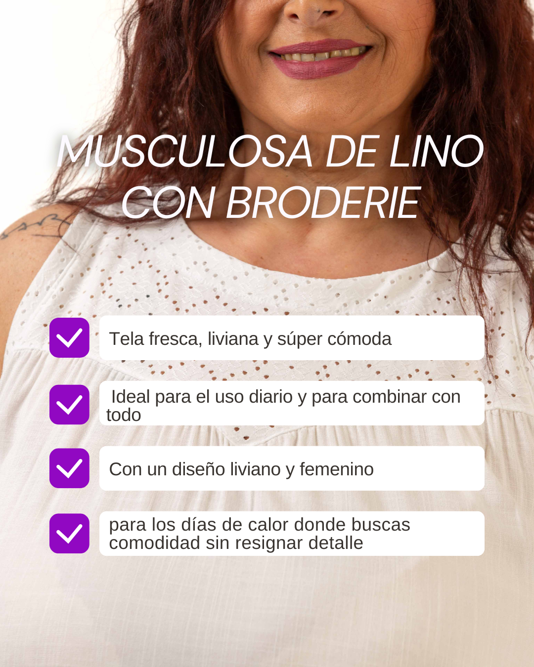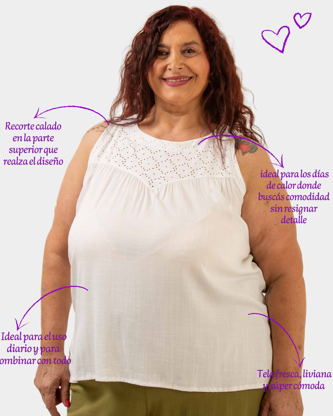 Esta musculosa es ideal para los días de calor donde buscás comodidad sin resignar detalle. Con un diseño liviano y femenino, se destaca por su recorte calado en el canesú que aporta textura y un toque especial, manteniendo una caída suave que acompaña el cuerpo sin marcar.