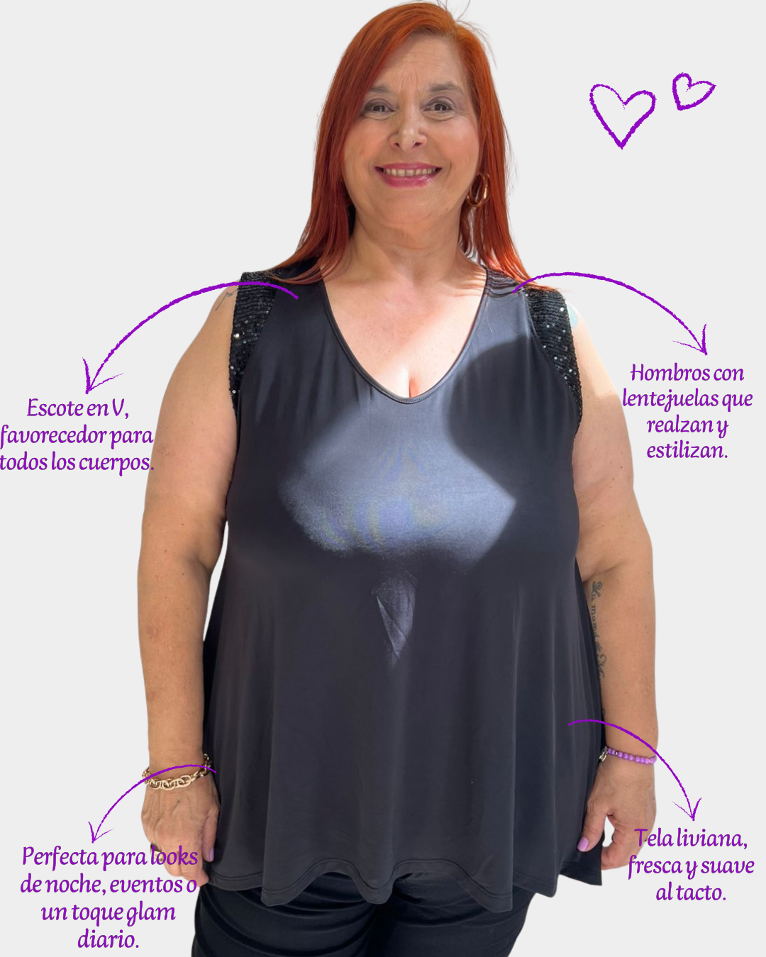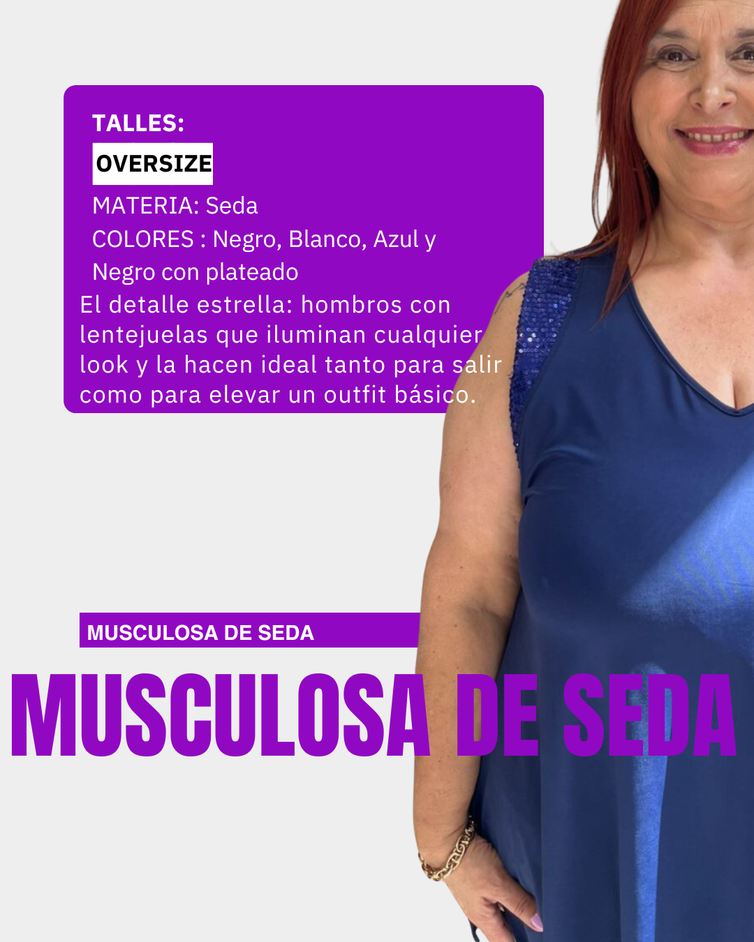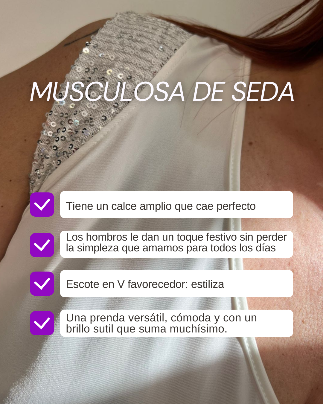 Sumá brillo y comodidad a tus looks con esta musculosa de seda suave y liviana. Tiene un calce amplio que cae perfecto sobre el cuerpo y un escote en V que estiliza sin marcar.