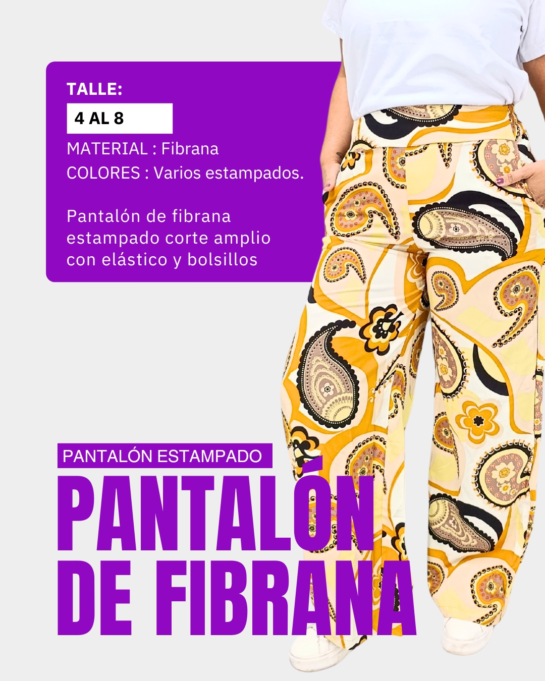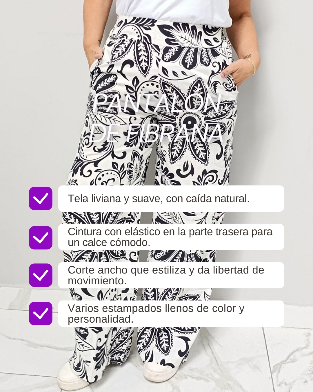 Frescura, color y movimiento en una prenda que vas a amar. Nuestro pantalón de fibrana estampado combina comodidad y estilo con un calce amplio y fluido, ideal para acompañarte todos los días con onda.