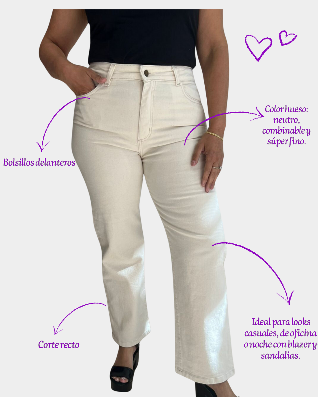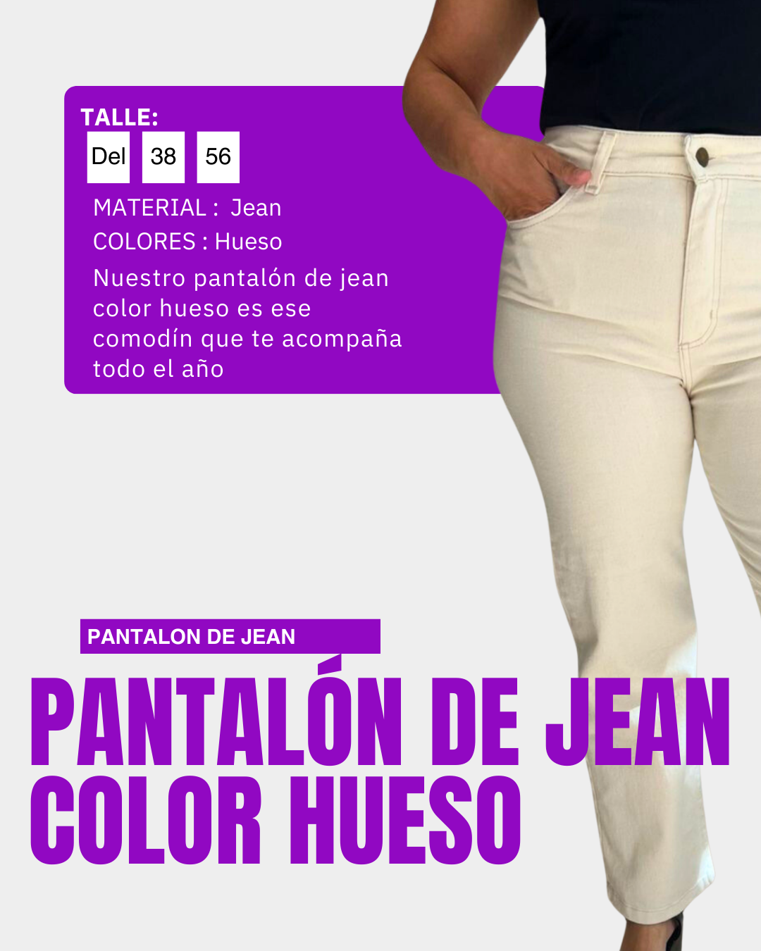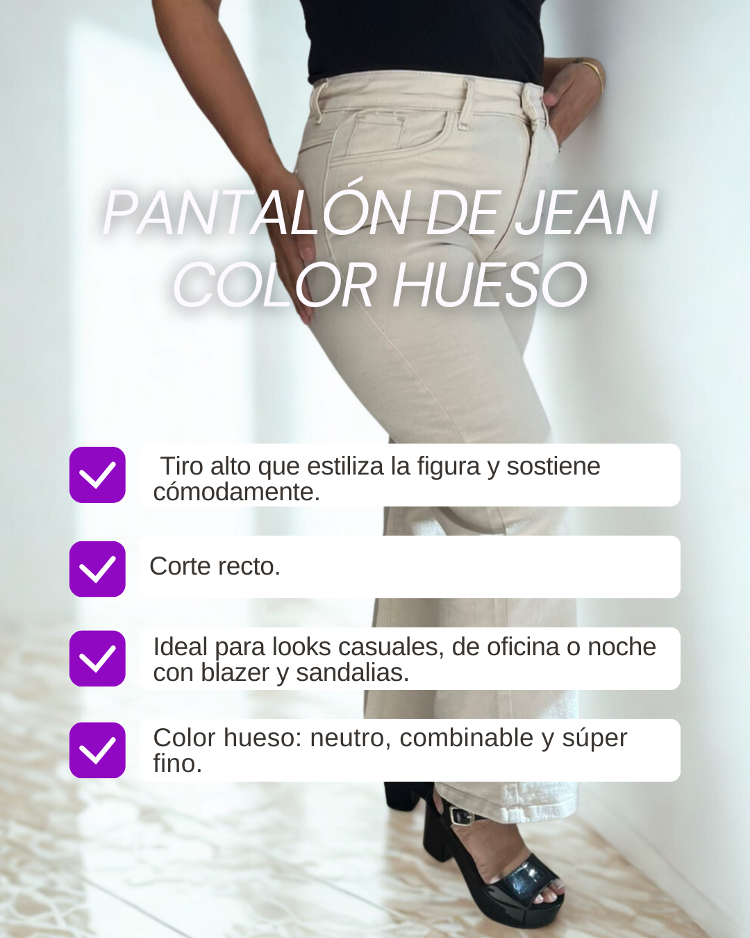 Un básico súper elegante para elevar cualquier look. Nuestro pantalón de jean color hueso es ese comodín que te acompaña todo el año: cómodo, hermoso y con un calce hermoso Su tiro alto recoge, estiliza y se adapta perfecto al cuerpo.
