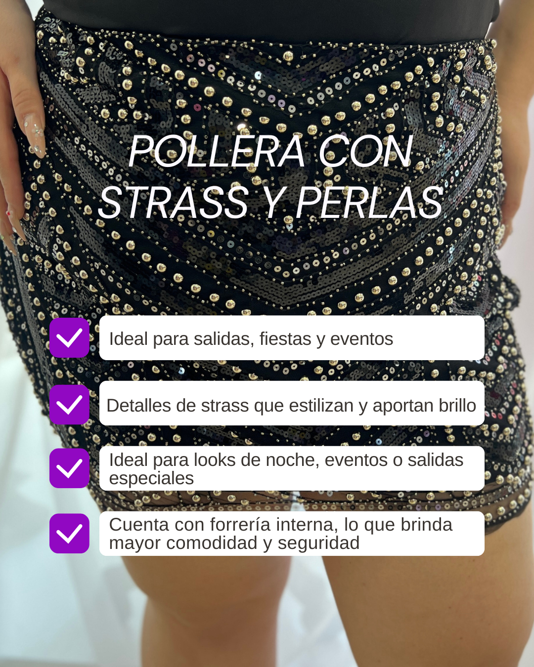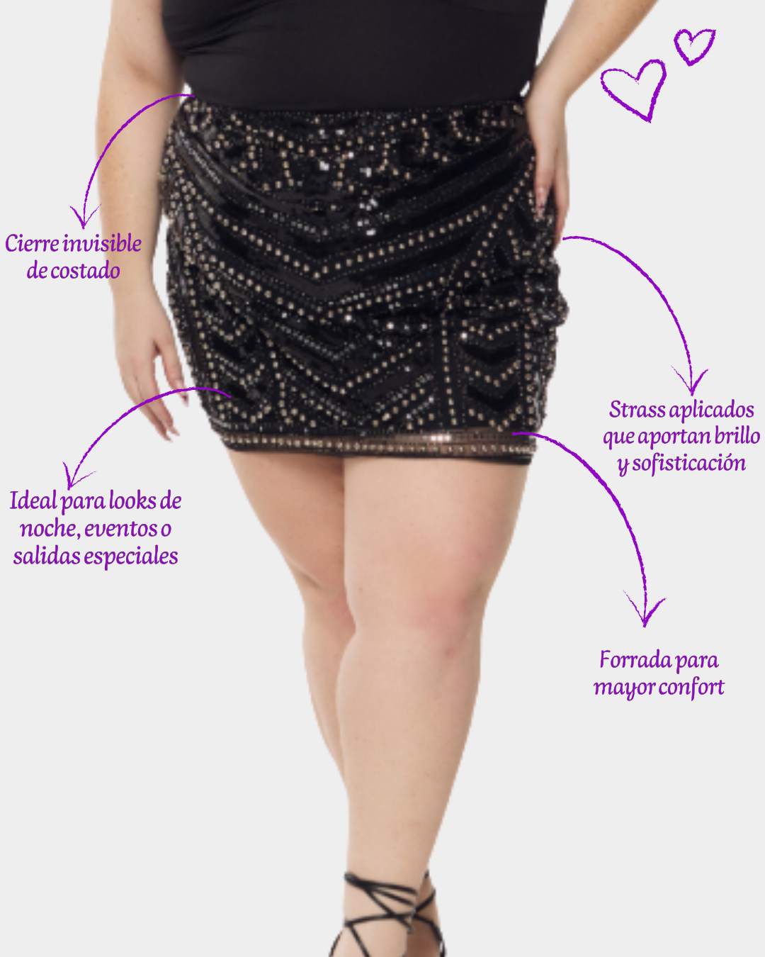 Esta pollera es puro glamour. Confeccionada en base de tul con aplicación de strass, su diseño geométrico aporta brillo y presencia sin perder elegancia. El calce ajustado acompaña las curvas y realza la silueta, convirtiéndola en una prenda protagonista para looks nocturnos y ocasiones especiales.