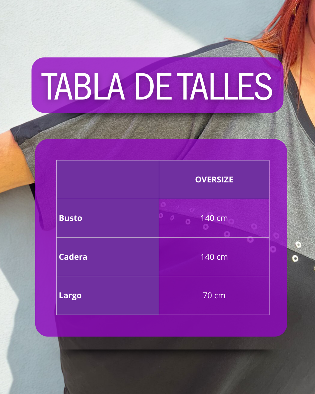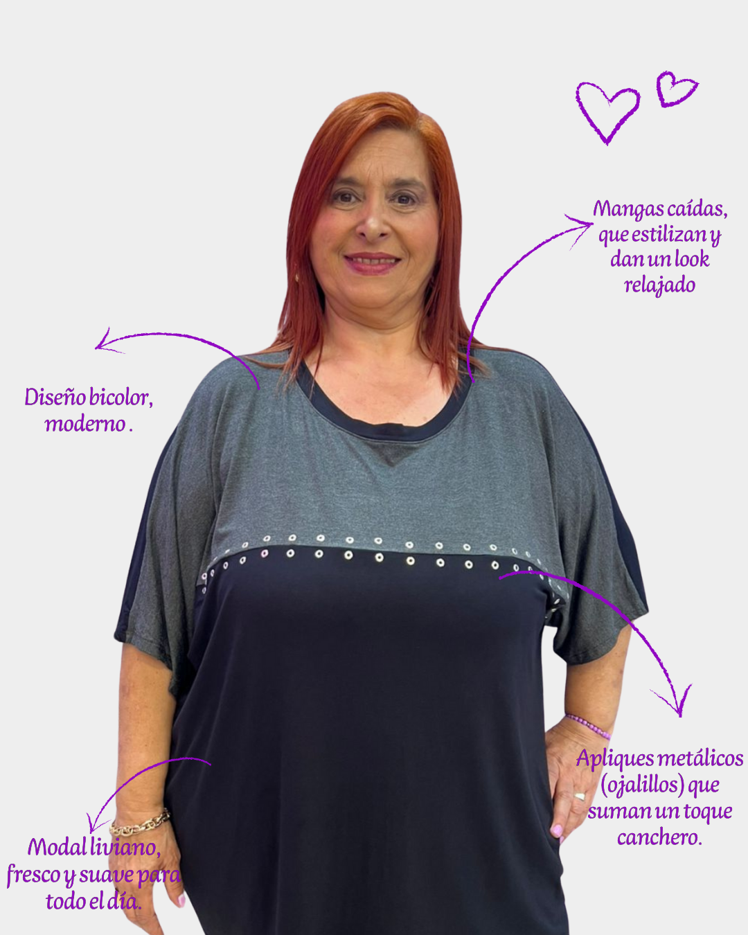 El detalle principal es la línea de ojalillos metálicos en el delantero, que le da un look urbano y actual sin perder comodidad. Tiene mangas caídas, calce oversize y un largo ideal para usar con pantalones ajustados o jeans.