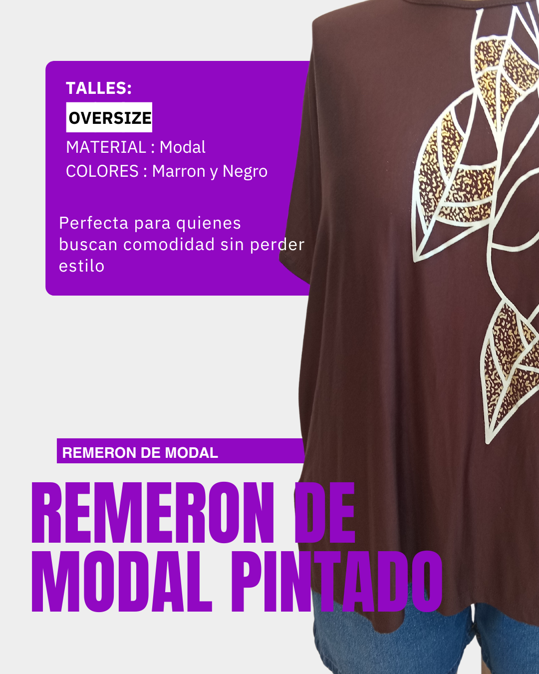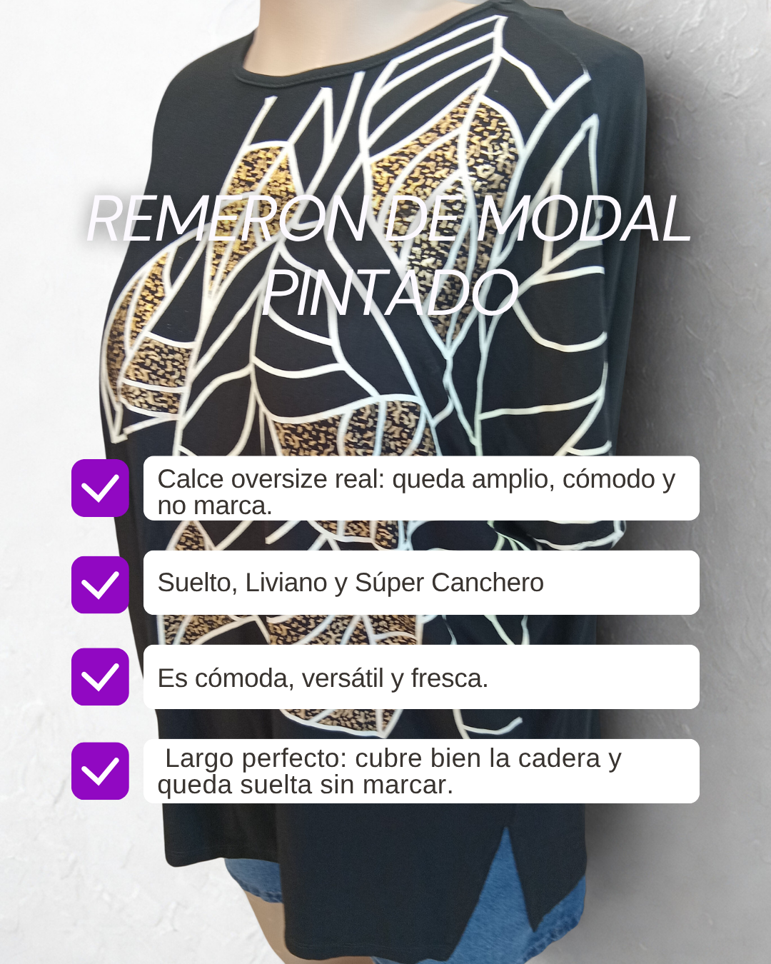 Un remerón que te acompaña todos los días con comodidad real y un diseño que llama la atención. Confeccionado en modal suave y liviano, trae una estampa pintada grande y moderna que levanta cualquier look. Disponible en negro y marrón.