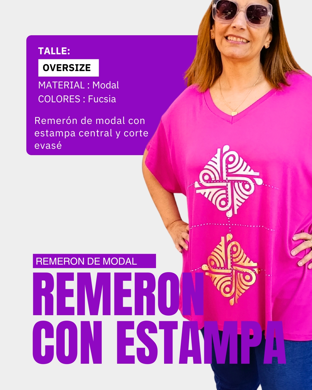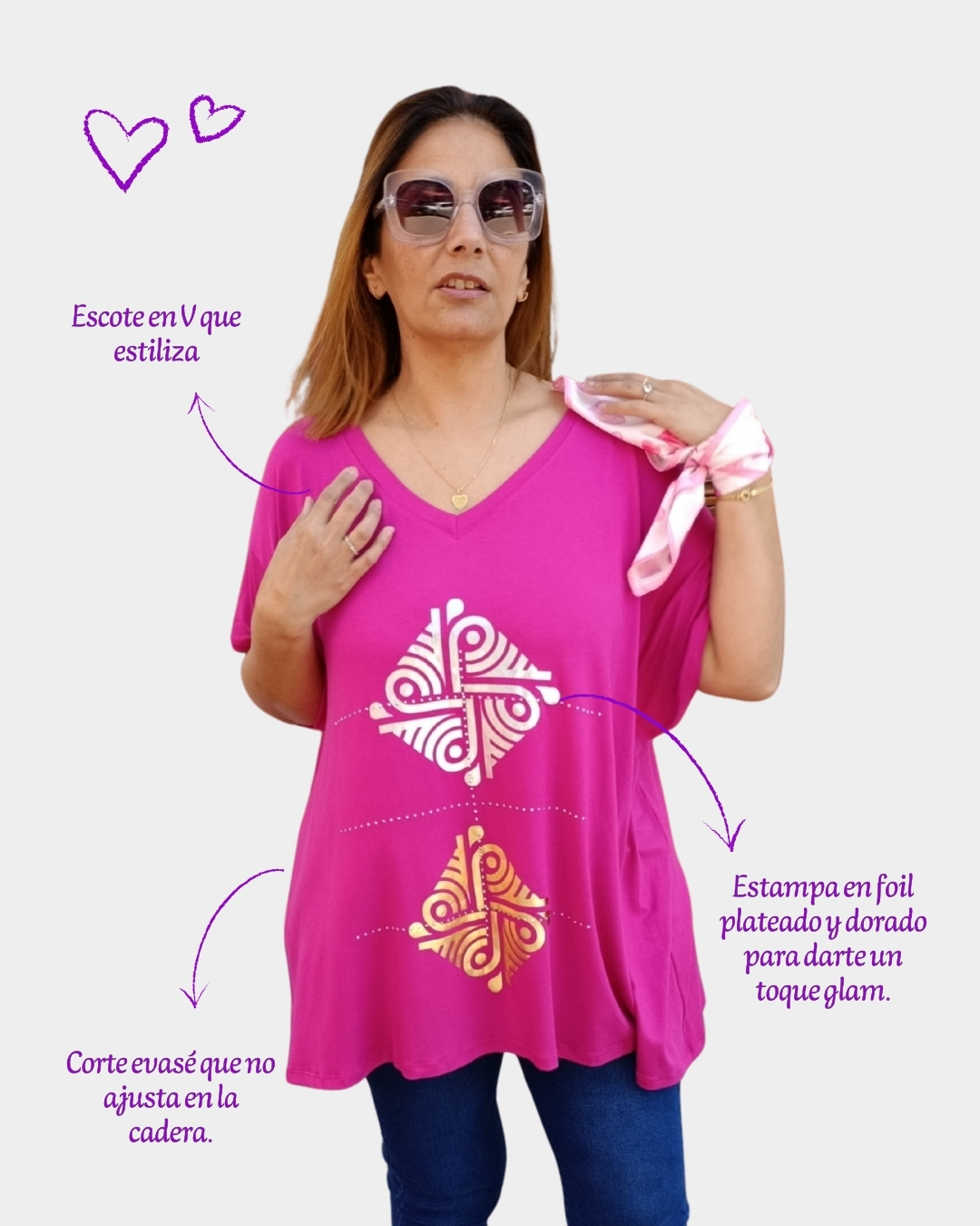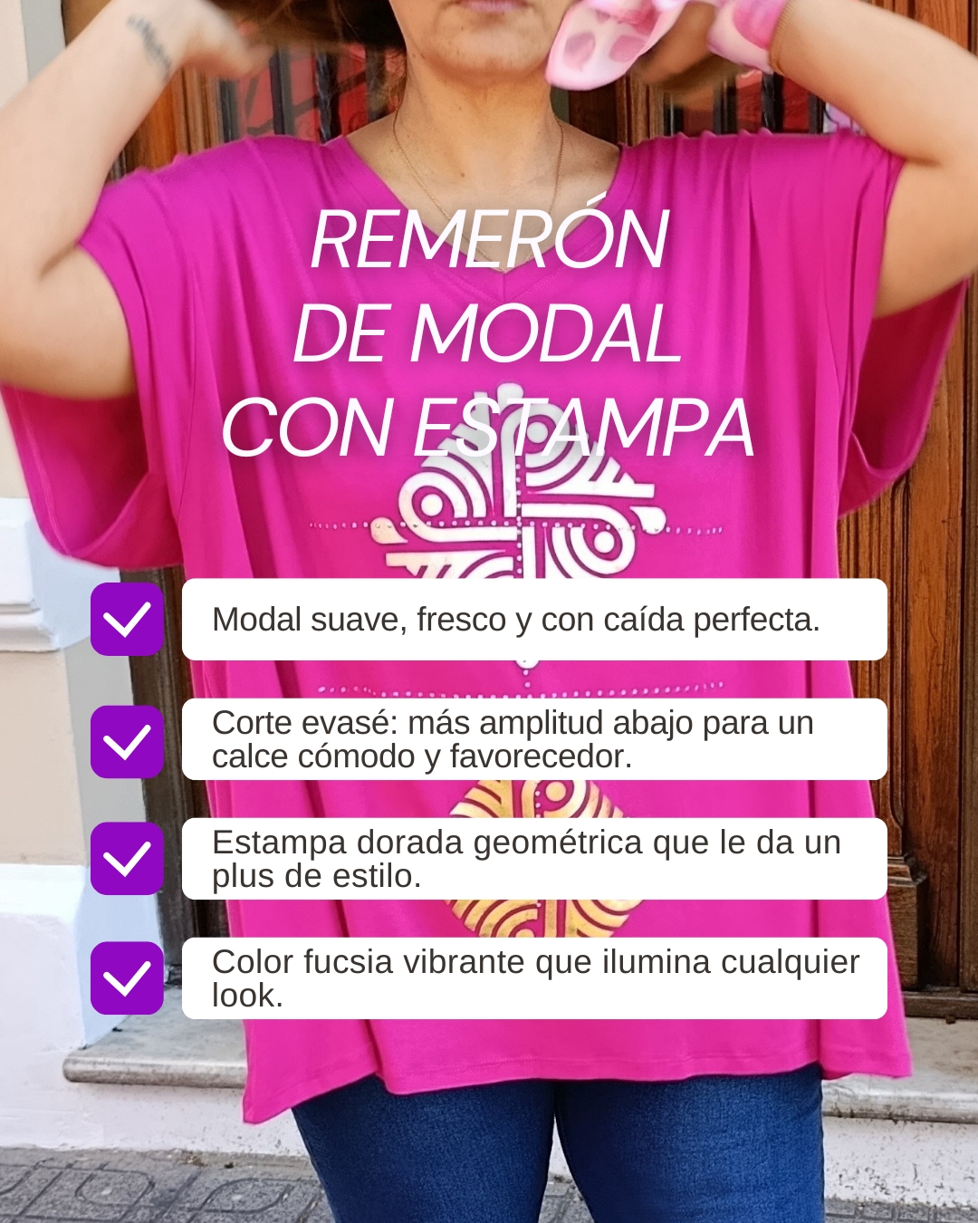 El toque de color que alegra cualquier look ✨. Este remerón de modal en tono fucsia intenso es pura energía y comodidad. Con su diseño amplio y corte evasé (más ancho en la parte inferior), cae con movimiento y estiliza sin marcar. Lleva una estampa geométrica dorada en el frente que suma brillo y detalle, ideal para transformar un outfit simple en uno con mucha onda.