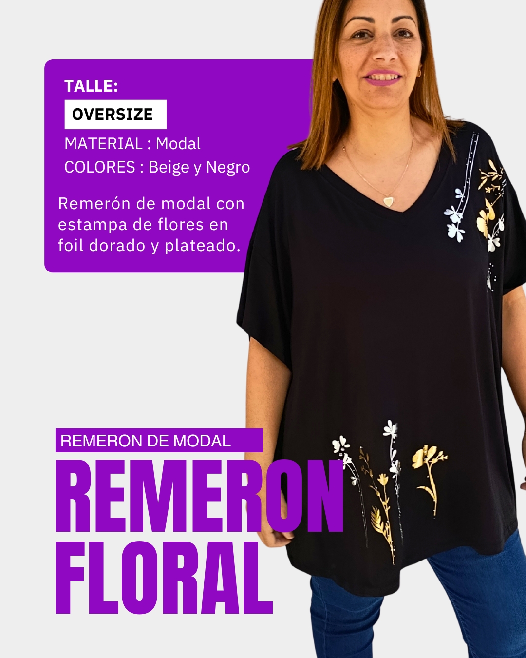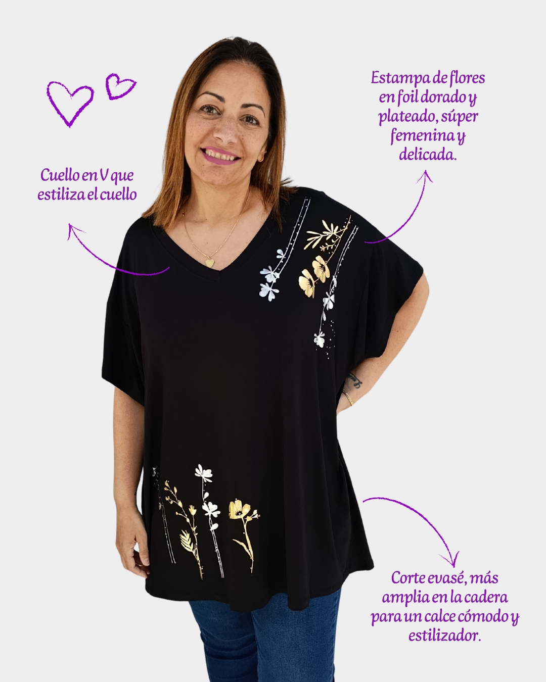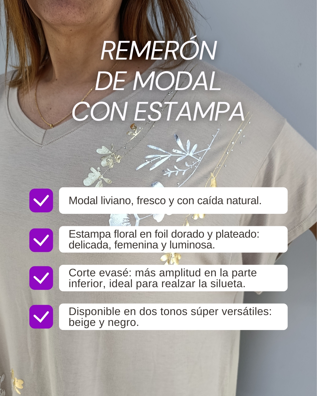 Un clásico con detalle delicado 🌸. Confeccionado en modal suave y fresco, este remerón se distingue por su estampa de flores en foil dorado y plateado, ubicada en hombro y parte inferior, que aporta brillo sutil y elegancia. Su corte amplio y evasé lo hace cómodo y favorecedor, con un calce relajado que acompaña el movimiento del cuerpo.