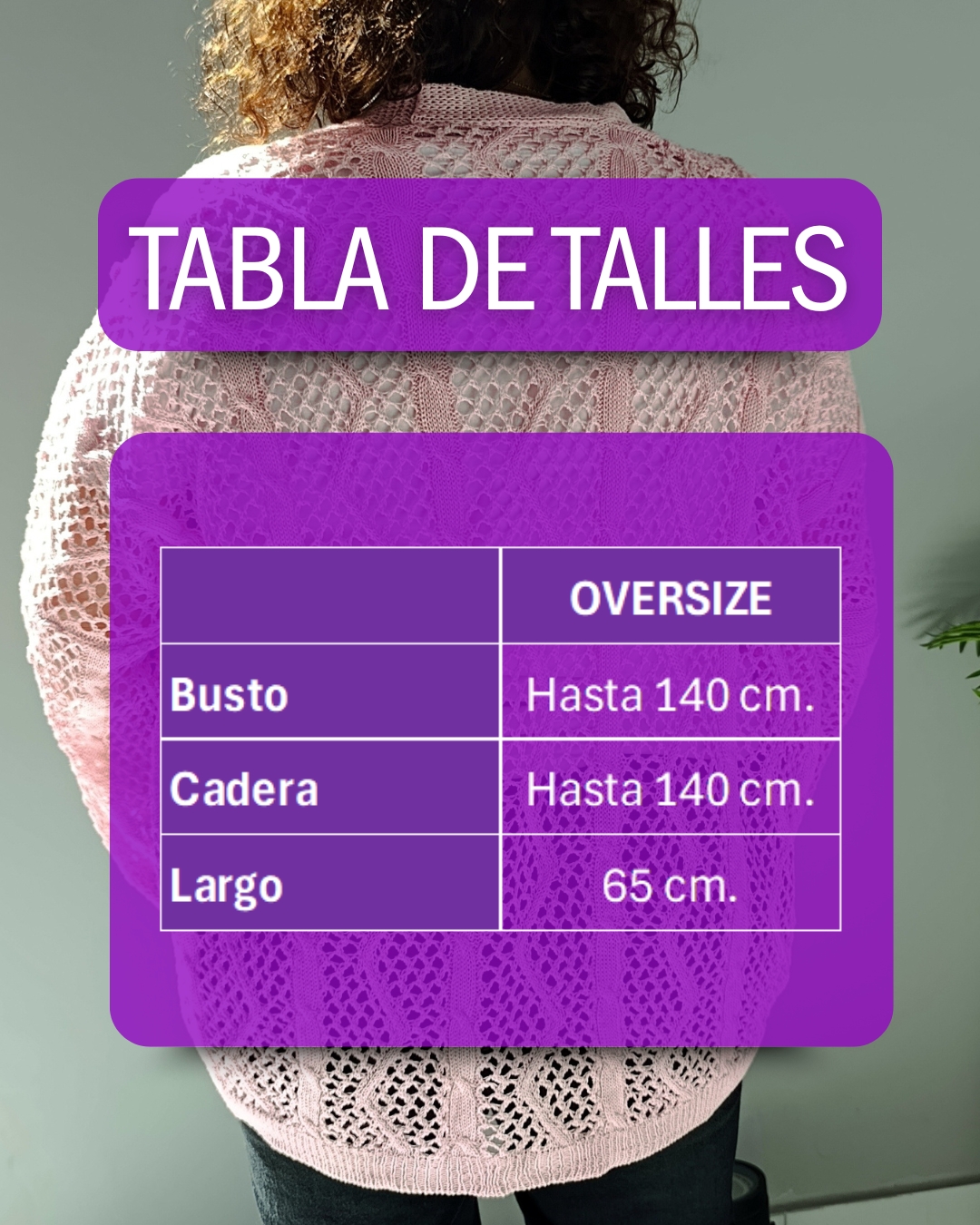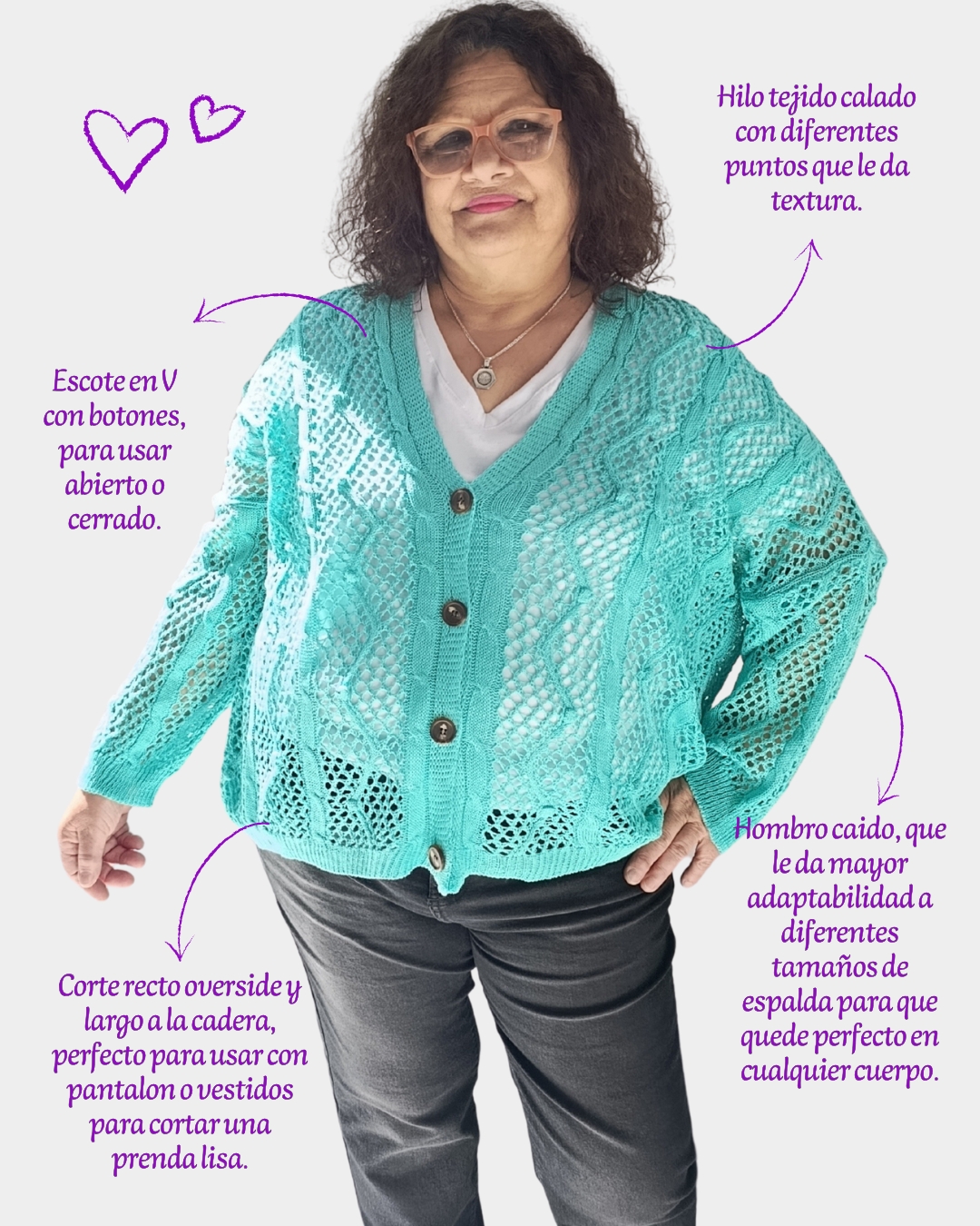 Un clásico moderno que suma textura y frescura a cualquier look. Su tejido calado lo hace liviano y respirable, ideal para entretiempo o para darle un toque chic arriba de tus básicos. Con calce oversize que se adapta a todos los cuerpos, es esa prenda que te hace sentir cómoda y canchera al mismo tiempo.