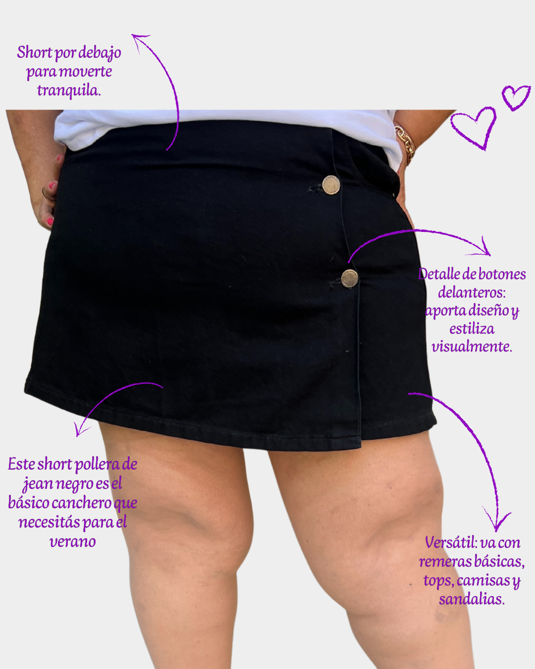 Comodidad, estilo y libertad de movimiento en una sola prenda. Este short pollera de jean negro es el básico canchero que necesitás para el verano: práctico, cómodo y con ese toque moderno.