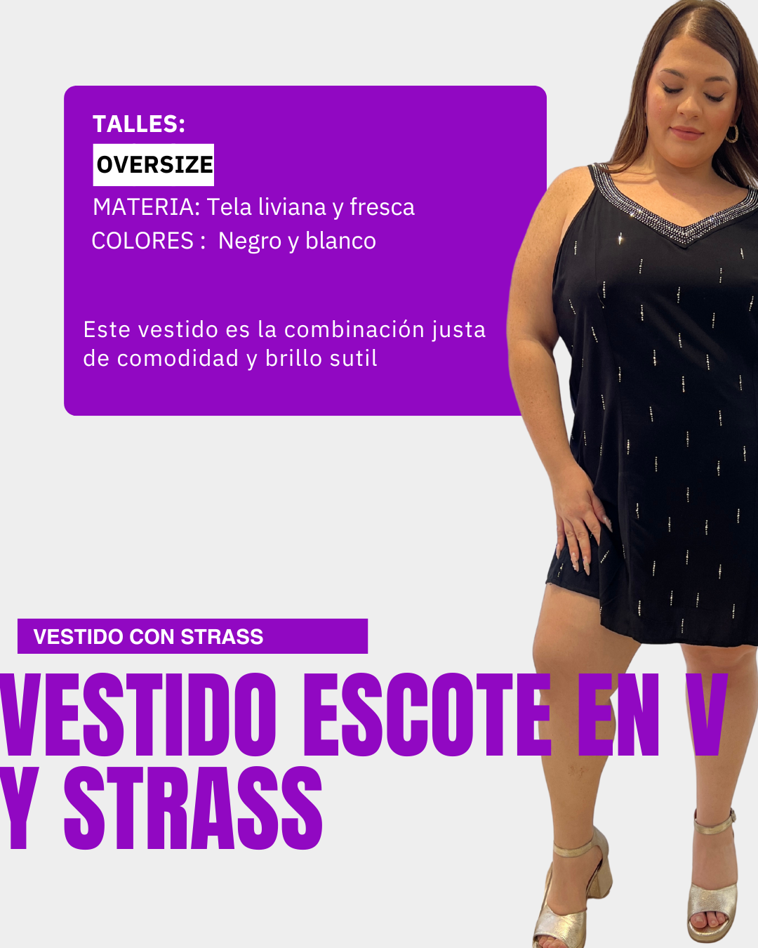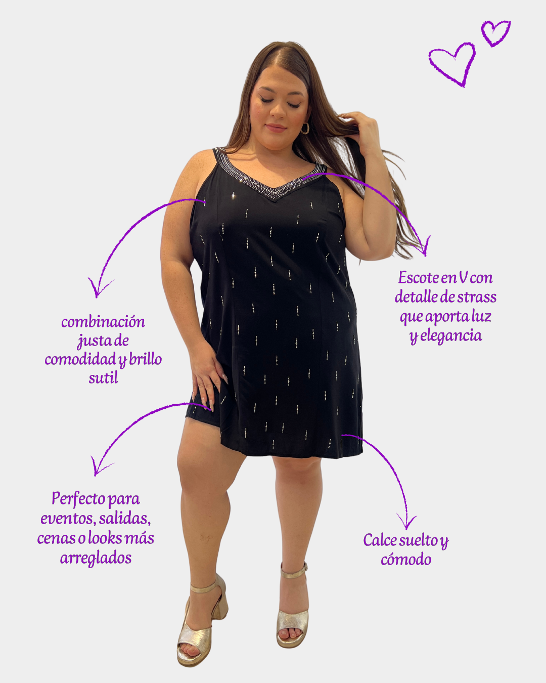 Este vestido es la combinación justa de comodidad y brillo sutil. Con un diseño fluido y femenino, se destaca por su escote en V trabajado con strass que ilumina el rostro y estiliza la parte superior del cuerpo. Ideal para usar tanto de día como de noche, es una prenda versátil que acompaña sin marcar.